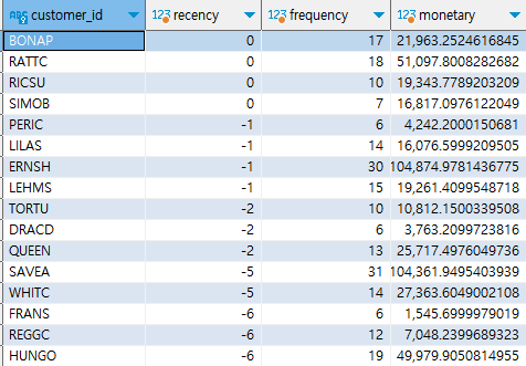 monetary, ntile(5) over(ORDER BY monetary) monetary_score