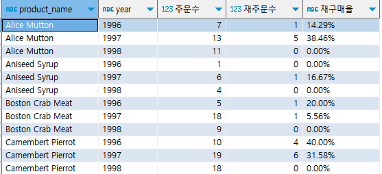 이후 이 결과를 년도와 상품별로 group by하여 최종적인 재구매율을 산출했다.
