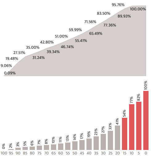 최종적인 객실 점수는 0 - 100사이의 점수로 도출되어야 하는데, 이대로 100점 환산을 하게 되면 분포의 우측 꼬리에 위치하는 소수의 객실만 높은 점수를 받게 되며 대다수의 객실이 매우 낮은 점수를 받게 되어 객실 점수가 고르게 분포하지 못했다. 또한 이렇게 산출된 점수는 리뷰 수가 이상치에 취급될 정도로 매우 많은 소수의 객실을 100점의 기준으로 두게 되므로 다소 엄격한 점수이기도 했다.