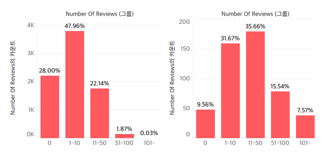 또한 운영기간별 리뷰 수의 분포가 다른 양상을 보이고 있었다. 따라서 객관적으로 객실의 리뷰 수가 많고 적음을 평가하기 위해서는 년도별 분포를 반영하여 '운영기간별 리뷰 수 정규화'가 필요하다는 결론을 내렸다.