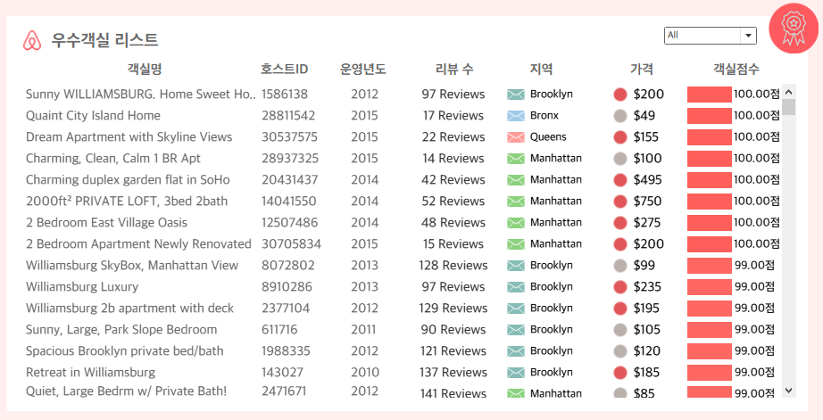 매개변수로 설정한 우수/관리 객실 기준을 만족하는 객실들의 리스트이다. 객실명과 호스트, 지역, 가격 등 객실에 대한 구체적인 정보를 포함하도록 구성하여 해당 객실들을 빠르고 간편하게 관리할 수 있도록 의도했다. 해당 리스트에서 가격 앞에 있는 원은 지역 평균보다 가격이 높은 경우 색칠되어있어 대략적인 가격을 비교할 수 있다.