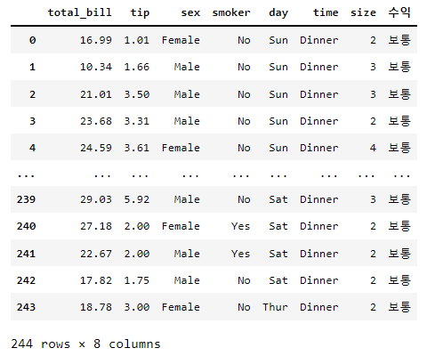 예를 들어 tip데이터의 total_bill을 통해 각 손님들이 얼마만큼의 돈을 냈는지를 범주화하는 '수익'칼럼을 생성하려고 합니다.