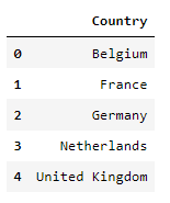 data = {'Country': ['Belgium', 'France', 'Germany', 'Netherlands', 'United Kingdom'],