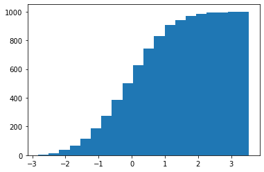 plt.hist(n, cumulative = True, bins = 20); #누적그래프