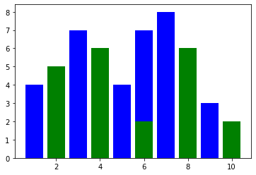 x2 = [2, 4, 6, 8, 10] #6에는 두 값이 모두 들어가기 때문에 바그래프가 겹치게 됨