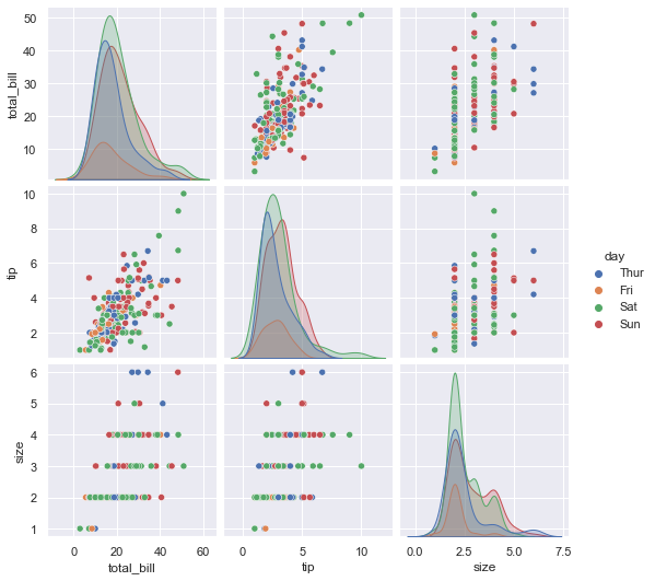 sns.pairplot(data = tips, hue = 'day') #day에 따라 다르게 그림
