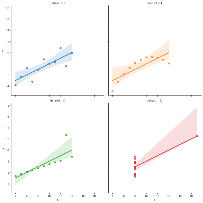 sns.lmplot(x = 'x', y = 'y', col = 'dataset', hue = 'dataset', data = df,