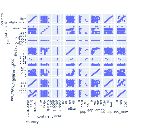 px.scatter_matrix(gap2007) #seaborn의 pairplot과 같습니다.