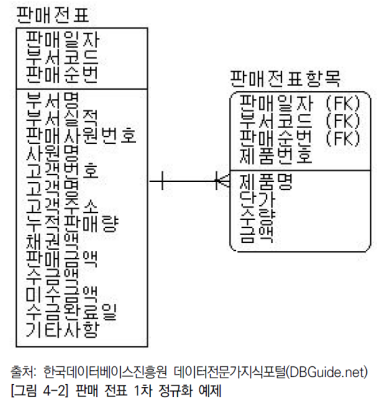 위 경우에는 판매일자, 부서코드, 판매순번이 모두 중복된 경우가 존재하여 해당 컬럼을 따로 뺀 상태로 제 1 정규화를 진행할 수 있다.