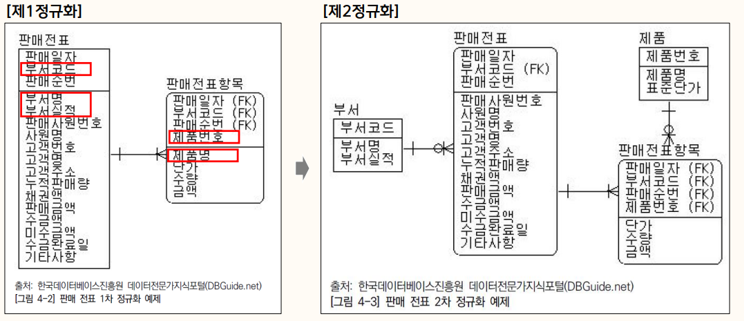 왼쪽 테이블을 보면 판매전표의 식별자 중 하나인 [부서코드]는 [부서명, 부서실적]을 결정짓는 하나의 고유한 키가 된다. 이는 완전 함수 종속을 위배하므로, 해당 테이블을 따로 분리하여 우측과 같은 [부서] 테이블을 생성하여 제 2 정규화를 진행할 수 있다.