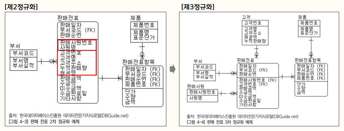제 2 정규화한 테이블에서 [고객번호]는 [고객명, 고객주소, 누적판매량, 채권액] 등 고객에 대한 정보를 특정지을 수 있는 속성이다. 이 속성들을 하나의 테이블로 분리하는 것이 제 3 정규화이다. 오른쪽 그림에서 해당 속성들이 [고객]이라는 새로운 테이블로 분리된 것을 확인할 수 있다.