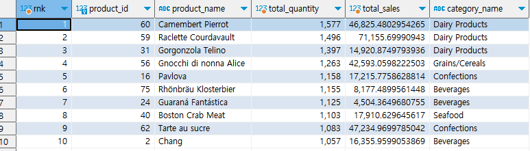 (SELECT product_id, product_name, sum(quantity) total_quantity, sum(sales) total_sales, category_name