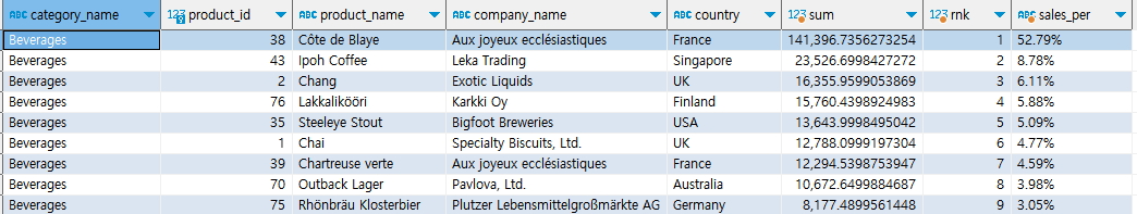 SELECT category_name, product_id, product_name, company_name, country, sum(sales),