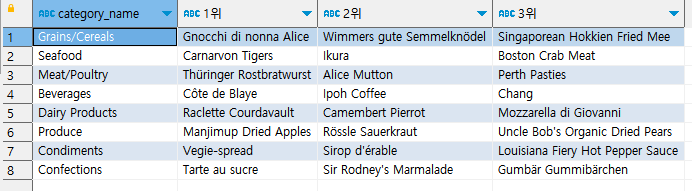 카테고리별 순위를 보여주고 싶은 것이기 떄문에 group by category_name을 해주고, select 구문에는 집계된 컬럼만 존재해야 하므로 max()라는 집계함수를 사용하였다. 조건에 해당하는 값은 1개씩이기 때문에 대부분의 집계함수를 쓰더라도 동일한 결과를 얻을 수 있다.