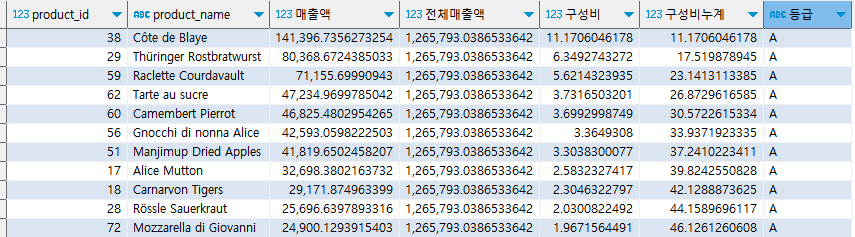 SELECT *, sum(구성비) over(order BY 구성비 desc) AS 구성비누계